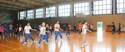 全5回授業があり、今回は3回目とあって、生徒も慣れた様子。今日で9割が完成するという。はじめに入念なストレッチをしてから、前回の復習をした。商大生が新しいダンスの手本となり、丁寧に指導していた。生徒達は、リズム良く踊り、心地良い汗を流していた。