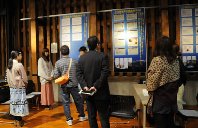 各プロジェクト13チームが、3分程度で活動報告を行なった。その後、参加者が各ブースに分れ、活動内容をポスター掲示し、参加者から意見・質問交流を深めた。
