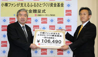 北海道コカ・コーラボトリング株式会社(本社:札幌市清田区・矢吹健次社長)より、「小樽ファンが支えるふるさとまちづくり資金基金」への寄附金贈呈式が、11月15日(木)、市役所本館(花園2)2階市長応接室で行われた。