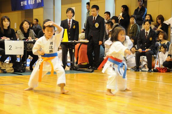 幼年の部男女混合の試合は、4歳から6歳までの13人が「形」と「基本」で行った。白い胴着に身を包み、緊張した面持ちで試合に臨んだ選手達の気合の入った「ヤー!」の掛け声が会場に響いた。応援に来ていた父兄は、コートを取り囲み、ビデオやカメラで撮影したり、声援を送っていた。