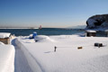 北運河を散策すると、雪が壁のように積もり、散策路は、人が1人通れるだけの道が除雪されていた。停泊しているボートでは、雪の重さで転覆してしまうのを防ぐため、雪降ろしをしている人もいた。