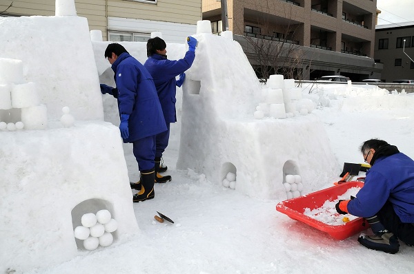 第15回小樽雪あかりの路会場のオブジェ作りが、8日(金)の開幕に合わせ、急ピッチに進められている。手宮線会場のスノートンネルはドームがほぼ完成し、内部の壁に雪を貼り付ける作業を行っていた。
