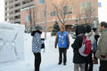 2月11日(月・祝)1回目の15:00には、21名が参加。3班に分かれ、ヴィブラントオタルを出発。おたる案内人の長谷川聖一さんと中村忠夫さんがガイド役を務めた。運河では、はしけの写真を見せて解説し、地元のガラスとろうそくで運河に200個もの浮き玉キャンドルが灯されると説明した。小樽倉庫や手宮線での鉄道についても解説し、雪あかりでは、13万本のろうそくが灯され、韓国や中国など2,500人のボランティアに支えられていると話し、参加者は熱心に質問を交えながら聞いていた。