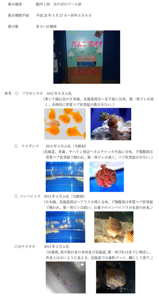 GW期間中の4月27日(土)から5月6日(月)まで期間限定で、子どもの日にちなみ「花よりだんご ウオ!」と題して、ダンゴウオ科のフウセンウオ・ナメダンゴ・コンペイトウ・ホテイウオの4種類の子ども達を、各3〜10の固体をひとつの水槽に区切って入れ、館内1階ほのぼのプール前で一堂に展示している。その可愛らしい姿に、来場者は興味を示していた。