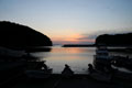 波もなく穏やか、まずまずの天候。眩しく輝く太陽がゆっくりと沈み、少しずつ眩しさが和らいでいく。湾の水面には、太陽と繋ぐように光の帯が伸びている。エメラルドグリーンの水面が夕日色に染まり、刻々と変化を遂げる様子は神秘的。