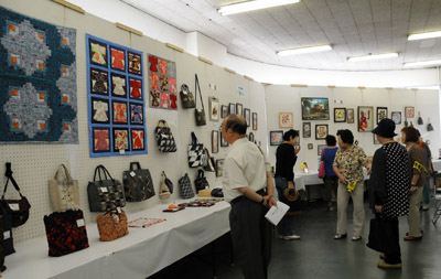 今回は、市老連14クラブ(82名)、一般5団体(154名)の、刺子や編み物、パッチワーク等の手芸品、陶芸、写真、書道、水彩や油彩、ちぎり絵、切絵の絵画、絵手紙、パソコン画など約500点の作品を展示している。趣味の域を超えた力作がずらりと展示され、出展者や友人らが大勢訪れ、楽しく鑑賞していた。指導する人の減少により、盆栽は昨年から、彫刻は今年から出展が無くなり、出展作品も変化していると関係者は話す。