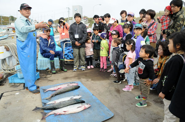 小樽商科大学マジプロの「祝津プロモーション」のメンバー3名もスタッフとなり、3班に分かれて参加者を誘導した。一行は、祝津港へ行き、漁師から直接、サケについての話を聞いた。漁師は、今朝5:30に岸から300mほどの海で獲ったサケを見せながら、参加者の質問に答えた。「メスとオスはどちらが多く獲れるか」の質問に「メスが、3分の2でオスが3分の1」と回答。そして、メスとオスの見分け方を実物を使って、「口がとがっているのがオスで、アブラビレの丸いのがメス。オスはメスよりヒレが一回り大きい」と説明した。