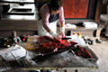 持ち帰ったサケの解体が、浜のお母さんによって行われた。参加者がぐるりと取り囲み、オスのサケからは白子、メスからはいくらを取り出した。3枚に下ろし、骨やハラス部分を取り除き、切り身にした。解体の手さばきに会場から拍手が沸いた。切り身にしたサケを串に刺し、番屋の囲炉裏で炭焼きにした。参加者は、手作りした塩を使って、焼いたサケを具におにぎりを作った。浜のお母さん達が朝から準備した、祝津流サケのあら汁とキュウリの漬物と一緒に、食育番屋ならではの食事を楽しんだ。
