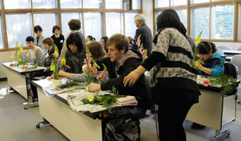 生け花では、斉藤支部長とスタッフ7名が指導にあたった。スナップ、ガーベラ、レザーファンを使用し「綺麗に見える姿を表現し、リズム良く生けて楽しんでもらえるよう工夫した。剣山や花切バサミを使用し、日本の伝統文化の生け花を分りやすく体験していただけたと思う」と話した。参加者は、スタッフにポイントを教わりながら花を生けていた。