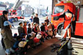 11月20日(水)10:15、同消防署前に、あおぞら保育園の年少から年長児までの53名と引率の田中園長と保育士4名が集合。はしごに乗る体験をする班と車両や道具の説明を聞く2つの班に分かれ、同署員16名が対応にあたった。