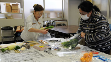 当日に、調査委員が各店舗で、長ねぎ、ほうれん草、大根、三つ葉、竹の子水煮 (中国産)、里芋、ごぼう、人参、みかんを買い求め会場へ持参。包装を外し袋に入れ、統一して計量。単価内容量表示や産地、価格動向について調査した。