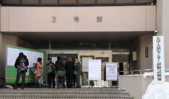 同大学では、試験教室を8つ設け、4階の第6試験室(406講義室)では、約70人が受験。緊張した空気の中、9:30から、地理歴史・公民の試験開始を前に、係から受験上の説明や携帯電話等の注意事項が伝えられ、問題冊子が配布された。選択での受験者は、1時間遅れで別会場で行われた。