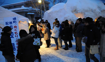 同商店街は、昨年から「小樽雪あかりの路」に参加している。「組合青年部では、何か振る舞いをして、堺町へ来る機会の無い人にも足を運んでもらいたいと考え企画した。堺町のぬくもりを多くの人に感じてもらいたい」と同組合・山本一彦氏は話す。