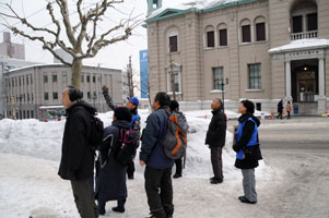 また、運河の倉庫群の氷柱にも触れ、参加者は、興味深く眺めていた。運河プラザとして使われている建物は、北海道で最も古い営業用倉庫で、木骨石造りであることや手宮線会場前では、鉄道の歴史にも触れ、日本で3番目にできた鉄道と話し、当時の写真を見せ解説し、参加者は、当時の様子に思いを馳せていた。