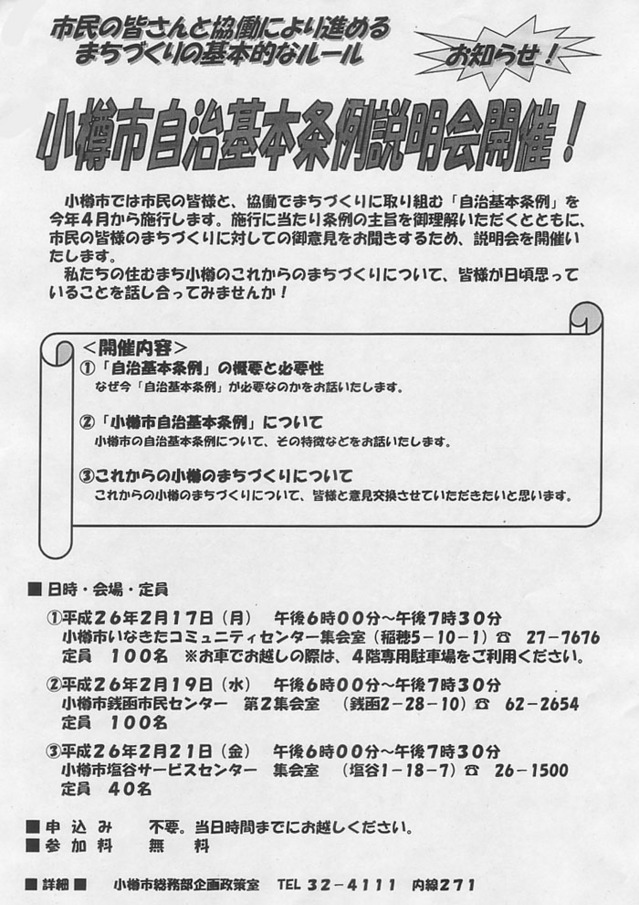 平成26年4月1日に施行される「小樽市自治基本条例」の説明会が、2月17日(月)18:00からいなきたコミュニティセンター(稲穂5)で開かれた。
