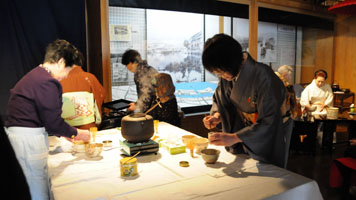 子ども達は、赤や黄色の華やかな着物を着せてもらい、羽やリボンの髪飾りをつけ、すまし顔でひな壇の前に立ったり座ったりポーズを決め、父親や母親は我が子の愛くるしい姿をカメラに収めていた。同時に、表千家によるお茶会が開かれ、淹れたてのお茶と菓子を味わった。