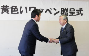 寄贈者を代表して株式会社損害保険ジャパン札幌支店小樽支社・石井剛宏支社長から、中松市長に「黄色いワッペン」が贈呈された。