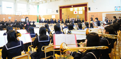 小樽市立菁園中学校(花園5・和田悦明校長)では、13:30から、本校体育館で、在校生236名、保護者、来賓、学校関係者が出席。同校吹奏楽部の生演奏が響き渡る中、担任を先頭に、緊張した面持ちの142名(男74・女68)が4組に分かれて入場した。市内14の中学校の中では、一番多い新入生となった。