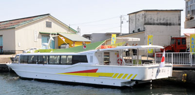 新観光船「あおばと」は、総トン数19トン・全長19m・最大幅4.5m・最大搭載人員88名(乗員2名を含む)・最大速力約18ノット(時速30km)。バリアフリー対応で、電動油圧昇降装置、車椅子対応型のトイレを設置。