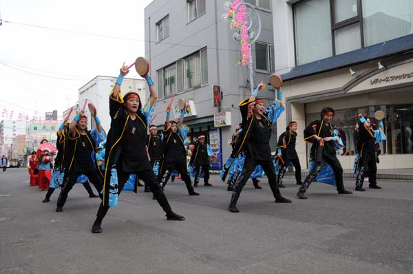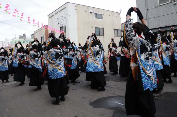 出場したのは、3回目となる「ミナオ・ドーレくしろ」から、札幌支部と釧路支部5名の21名。4回目の出場の石狩を拠点とする「夢鼓動大地21」の4歳から50代までの34名。同じく4回目となる小樽商科大学翔楽舞157名の3組による演舞が、商店街いっぱいに舞踊った。