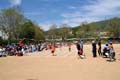その後、青軍と黄軍に分かれて、気合の入った応援合戦が行われた。最初の種目は、徒競走で、1年生は50m、2年生は60m、3・4年生は80m、5・6年生は100mと、学年に合わせて走る距離を設定した。友達や家族の声援を受けながら、児童は、元気にゴールを目指し走った。ゴール付近には、カメラやビデオを構える保護者の姿が多く見られた。