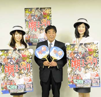 ミス潮としてまつりに華を添える田中寛子さんと本間美帆さんが紹介され、今年度のポスターに採用し、B2版フルカラーで2,100枚を印刷。6月12日(木)から、市内外や北海道などの関係機関、市内金融機関や宿泊施設・店舗・商業施設などへ配布する。