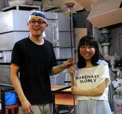 7月25日(金)から27日(日)、旧手宮線を会場に開催する「第6回小樽がらす市」に併せ、行なわれた「グラスデザインコンテスト」中学生の部で、最優秀賞に潮見台中学校3年生の保川朋佳さんのデザイン画が受賞。そのデザイン画に基づき、7月11日(金)17:00から、硝子工房il PONTE(色内2)のガラス工房で、同工房チーフの永田琢也氏がグラスを制作した。その工程を保川さんと母親が見学した。
