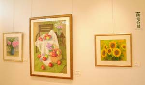 杉山英二さんは、北運河の冬の風景や勝納運河を描き、中條由佳里さんは、美味しそうなりんごやひまわりを出展。