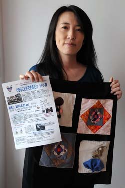 同プロジェクトのしおみさんは呉服店と縁があり、津波で泥だらけになった着物や反物を何かに使えないかと相談され、被災した布をリメイクしたコンサート衣装で、クラリネット奏者のしおみさんの夫が演奏会を開催。その衣装づくりから出たはぎれを、ひと針ひと針願いを込めて縫い合わせ、タペストリーとして作品を作った。