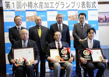 小樽で製造の水産加工品をアピールする「第1回小樽水産加工グランプリ」が決定し、10月15日(水)11:00から、小樽市役所(花園2)2階市長応接室で、表彰式が開かれた。