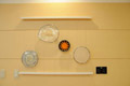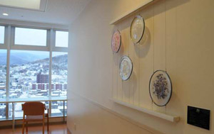 病棟のある3階・4階・5階・7階のデイルームと7階のラウンジの5ヶ所の壁には、各フロアに相応しい組み合わを考え、4枚の皿を壁から浮かした状態でワイヤーで吊るしディスプレイした。光の当たり具合で、様々な表情を楽しめる。