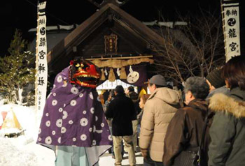 除夜の鐘の音が響く中、小樽稲穂3にある小樽鎮座龍宮神社(本間公祐宮司)では、0:00前から市民がぞくぞくと境内に集まった。道指定無形文化財の松前神楽奉納や獅子舞が披露された。獅子舞は境内に降りて初詣客の頭を噛み、無病息災を祈願した。