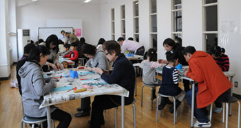 春休み中とあって、子どもから大人まで、また、お父さんの参加も多く、家族で万華鏡づくりを楽しんでいた。
