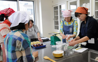 毎年4月に開かれる料理講習会は、同会の取り組みを知ってもらおうと、会員以外の人にも単発で実施している。今回は、家庭で簡単に作れるおやつ「タルト・プリン・大福」の作り方を、同会家庭料理担当の田宮けい子さん・おもてなし料理担当の樋渡清美さん・ベテランの金澤さんの3名が指導にあたった。