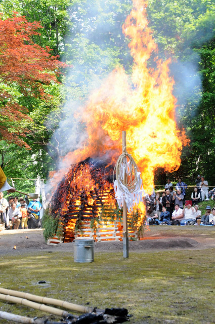 僧侶4・5人が、火渡りに使われるトドマツの丸太を割り、会場の中心部に角材を積み上げ、枝葉で覆い、数日がかりで準備した。結界と言って、信徒でも入ることのできない聖なる領域の中で作業が進められた。