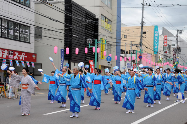 ホッカングループは、道内各地の関連会社から100名が参加し、缶の製造会社とあって、鳴子の代わりに、ねぶたの絵が書かれた缶でできた皿状の楽器・当り鉦(しょう)「ガガシコ」を、カチカチならして踊り、周辺に缶の音が鳴り響いた。