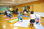 ホールでは、「OTARU YOGASTUDIO yuju」の高橋亜希子さんが親子ヨガを指導。親子でスキンシップを図りながら笑顔でヨガを体験していた。