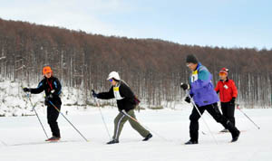 ストレッチで準備運動を行った後、いよいよ、スキーを着けて、1周約500mのコースに出た。初めてスキーを着ける参加者は、戸惑いながらも熱心に指導者からの説明を聞いていた。