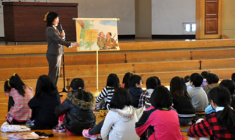 小樽市立塩谷小学校(渡辺秀行校長・全校児童91名)で、学校ブックフェスティバルが、2月3日(水)9:50から開かれ、図書の貸出しと合わせて、大型絵本やエプロンシアターなどの読み聞かせも行われた。主催は、北海道道立図書館(江別市文京台)・小樽市教育委員会。