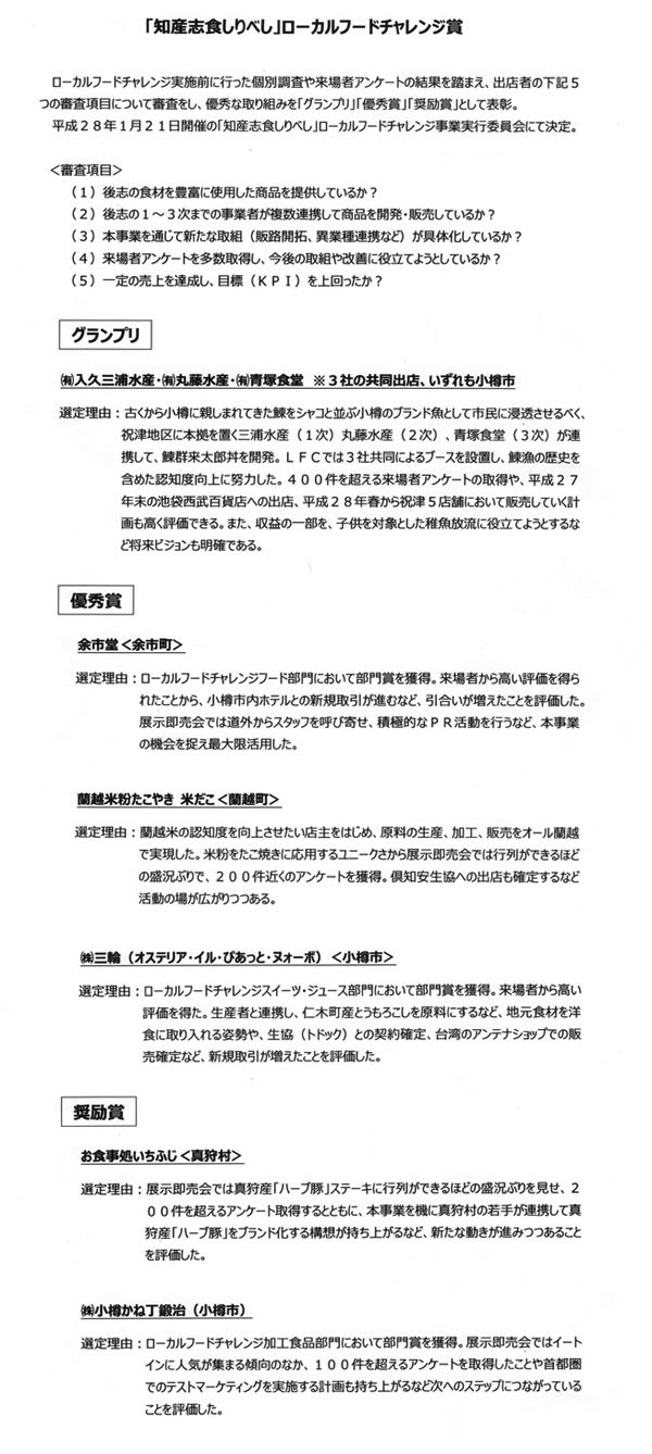 小樽商工会議所(稲穂2・山本秀明会頭)は、昨年10月11日・12日に、後志の素材を生かした逸品を販売する「知産志食しりべし」ローカルフードチャレンジを初開催し、35店舗が一堂に集まった。その中で、目標達成度や今後の販路拡大などの5つの審査項目をもとに、ローカルフードチャレンジ賞を、平成28年1月21日の同事業実行委員会で選定した。