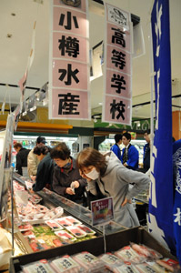 小樽水産高等学校(若竹9)の生徒が49日間の乗船実習の中で、ハワイ沖・マグロ延縄実習で捕獲した”元気まぐろ”を、4月9日(土)9:00から、コープさっぽろ南小樽店(入船1)と同みどり店(富岡1)で販売し、大勢のまぐろを買い求める客で賑わった。