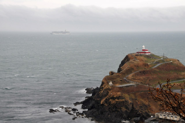 客船ファンは、祝津パノラマ展望台まで移動し、灯台とクルーズ船のタイミングを狙って撮影を楽しんでいた。