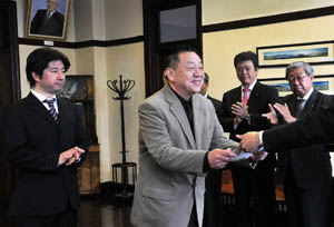 その合格証授与式が、5月11日(水)10:00から、市役所(花園2)2階市長応接室で開かれ、森井市長から、合格証が手渡された。