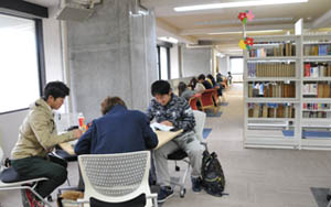 同大附属図書館は、2014(平成26)年2月にリニューアルオープンし、蔵書46万冊。1階が書庫、2階がオープン学生スペースで、テーブルや椅子がニーズに合わせて組み合わせられ、学生が会話をしながら調べ物や勉強などを進めることができる。3階は、1人で勉強できる落ち着いた雰囲気となっている。