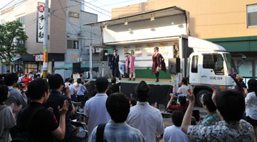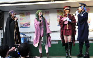 次に、まるたにあやの氏が登場し、ノリの良い曲でファンも熱狂。Luu氏とたかはしはるな氏とともに「千本桜」を歌い、観客は絶好調に盛り上がり、花園銀座商店街に、ファンの声援が響きわたった。