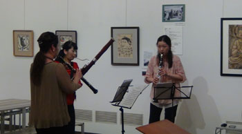 小樽ゆかりの版画家5名が集う版画作品会場で、小樽在住の中村隆夫氏が指揮を務める札幌コダーイ合唱団23名と、中村和乃子氏(オーボエ)・大久保陽子氏(クラリネット)・石黒玲氏(ファゴット)が出演し、作品に合わせた選曲で合唱を披露した。