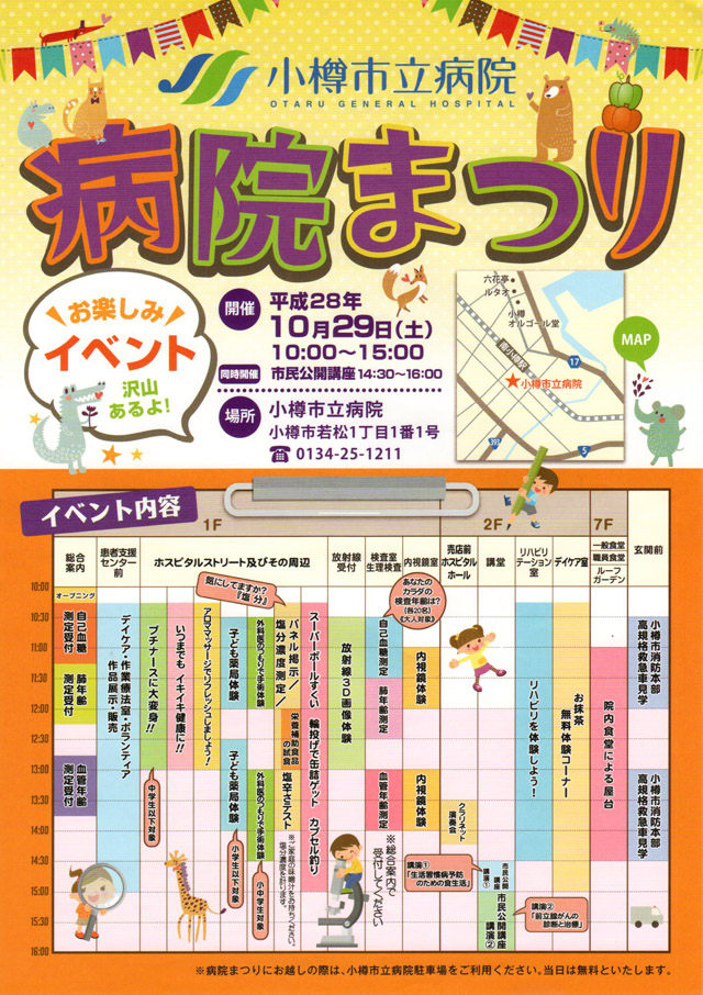 市立小樽病院(若松1)は、10月29日(土)10:00から15:00まで、病院まつりを開催する。