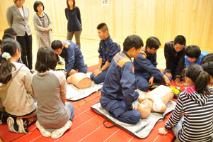 火元を想定し、水が出る消火器を使った初期消火訓練や、訓練用のダミーを使ったAED(自動体外式除細動器)の使用方法と心肺蘇生法を体験。防火衣の展示と着装体験、東日本大震災に関連したDVD上映などが行われ、児童は学年ごとに各ブースを回った。
