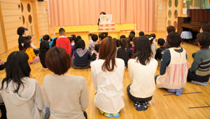 その後、年長児を対象に、防犯対策「はなちゃんのかえりみち」の紙芝居を読み、知らない人についていってはいけないことを、「いかのおすし」、いかない・のらない・大きな声を出す・すぐに逃げる・しらせる行動をとるよう指導。市内での不審者による声かけは100件以上あり、危険が多いことを伝えた。
