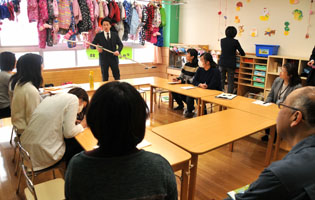別の職員が110番通報し、警官2名が駆けつけ、不審者を取り押さた。訓練の様子を、他の保育所の保育士も見学に訪れていた。